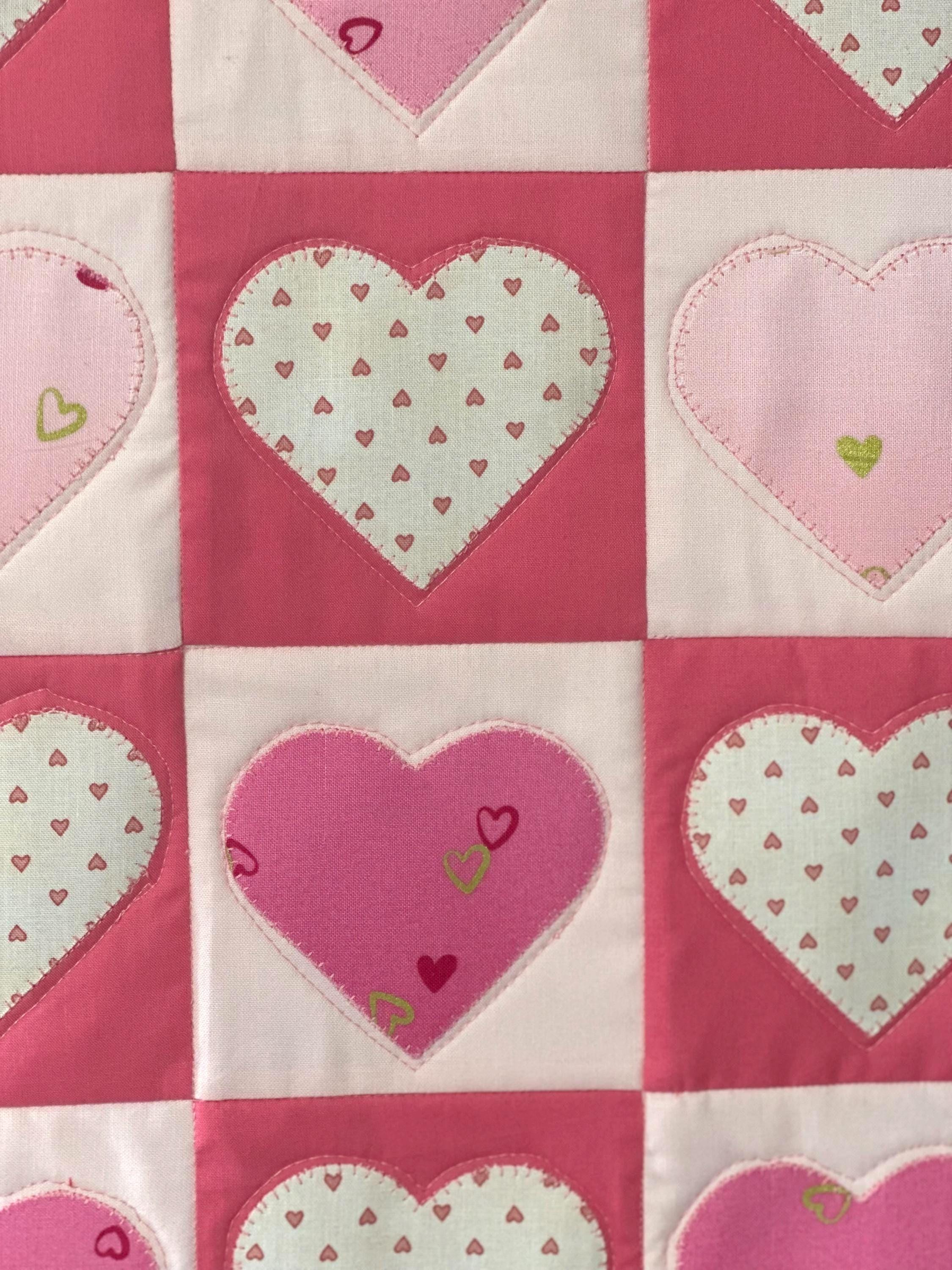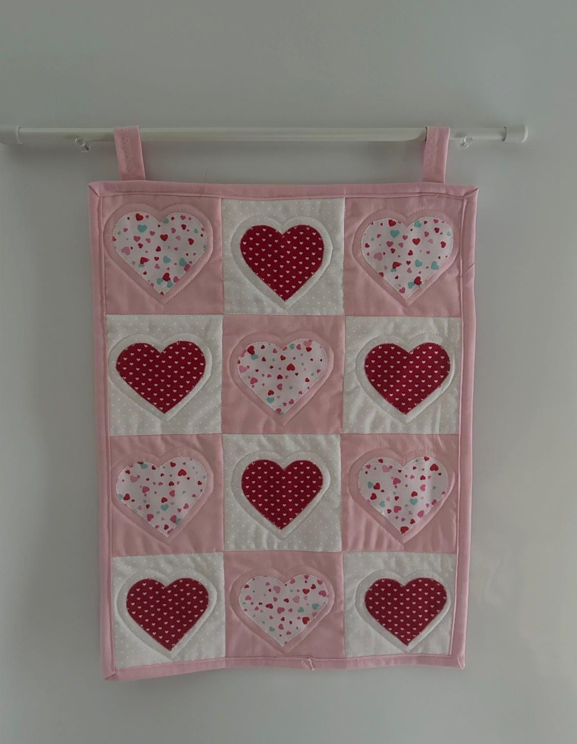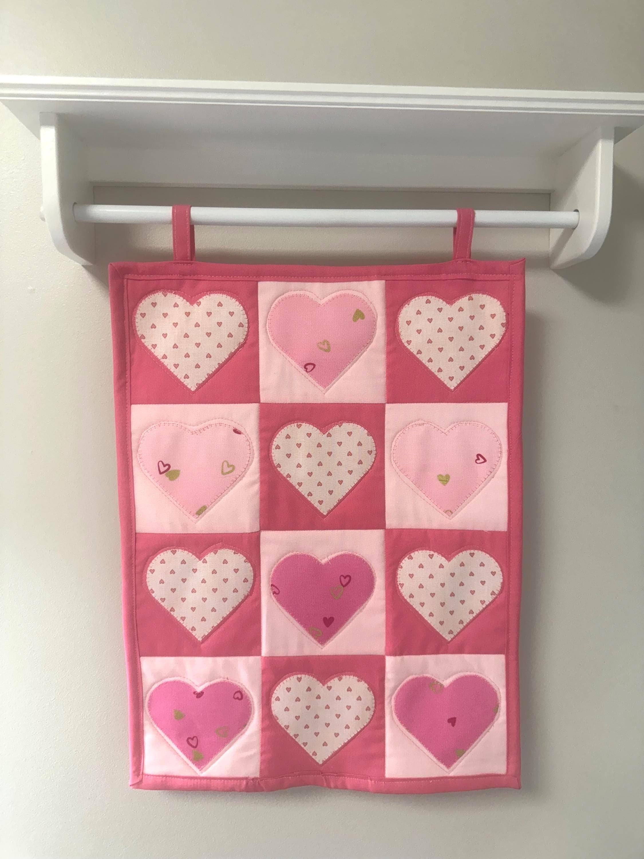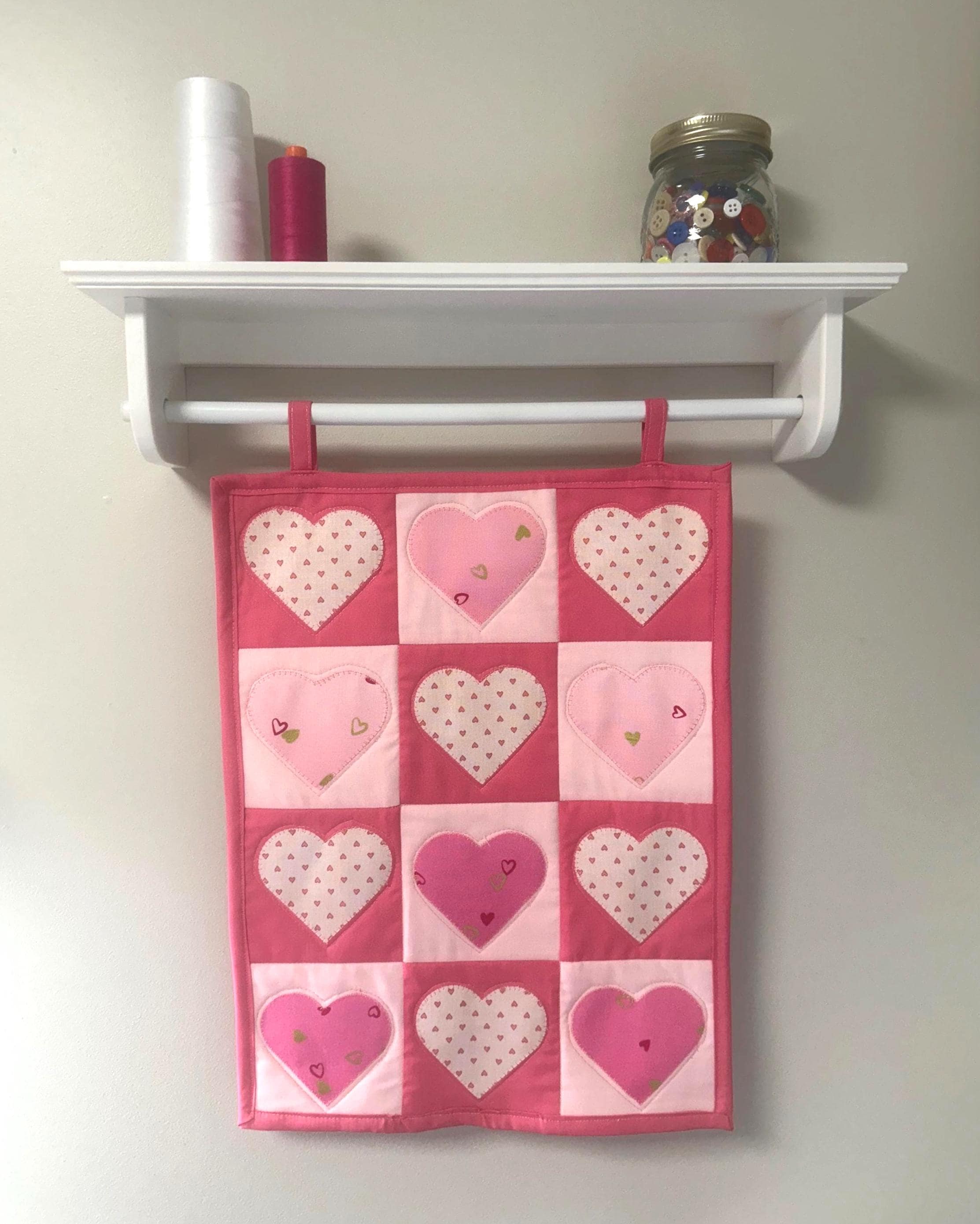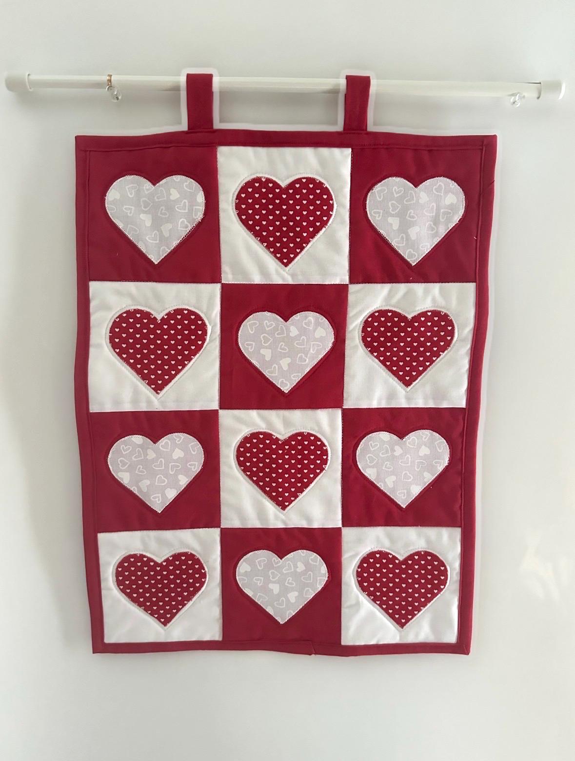 Hearts will brighten up your wall or door for Valentine’s Day. Quilted wall hanging is made from cotton fabric with cotton batting. Hang in your home or office.