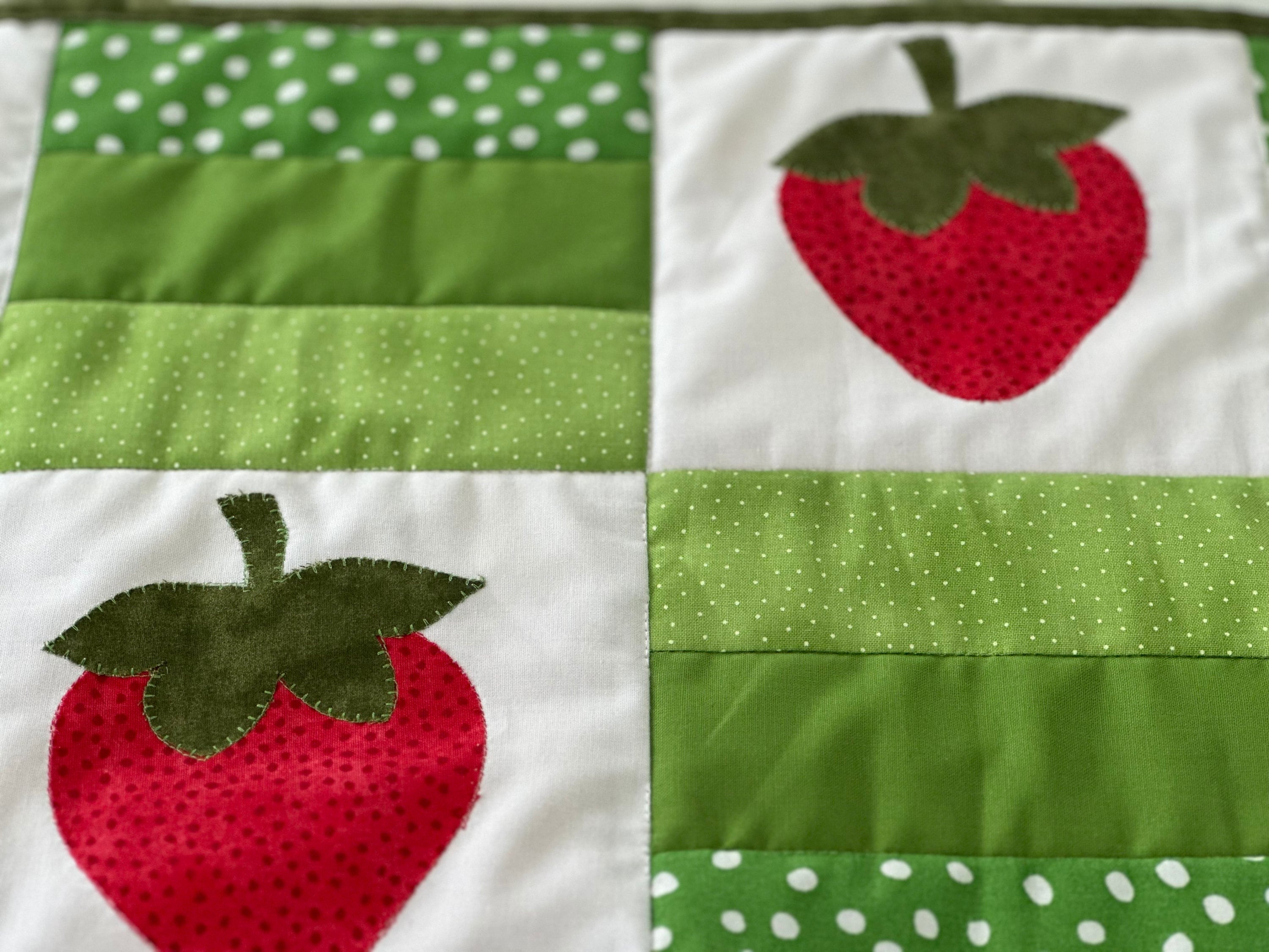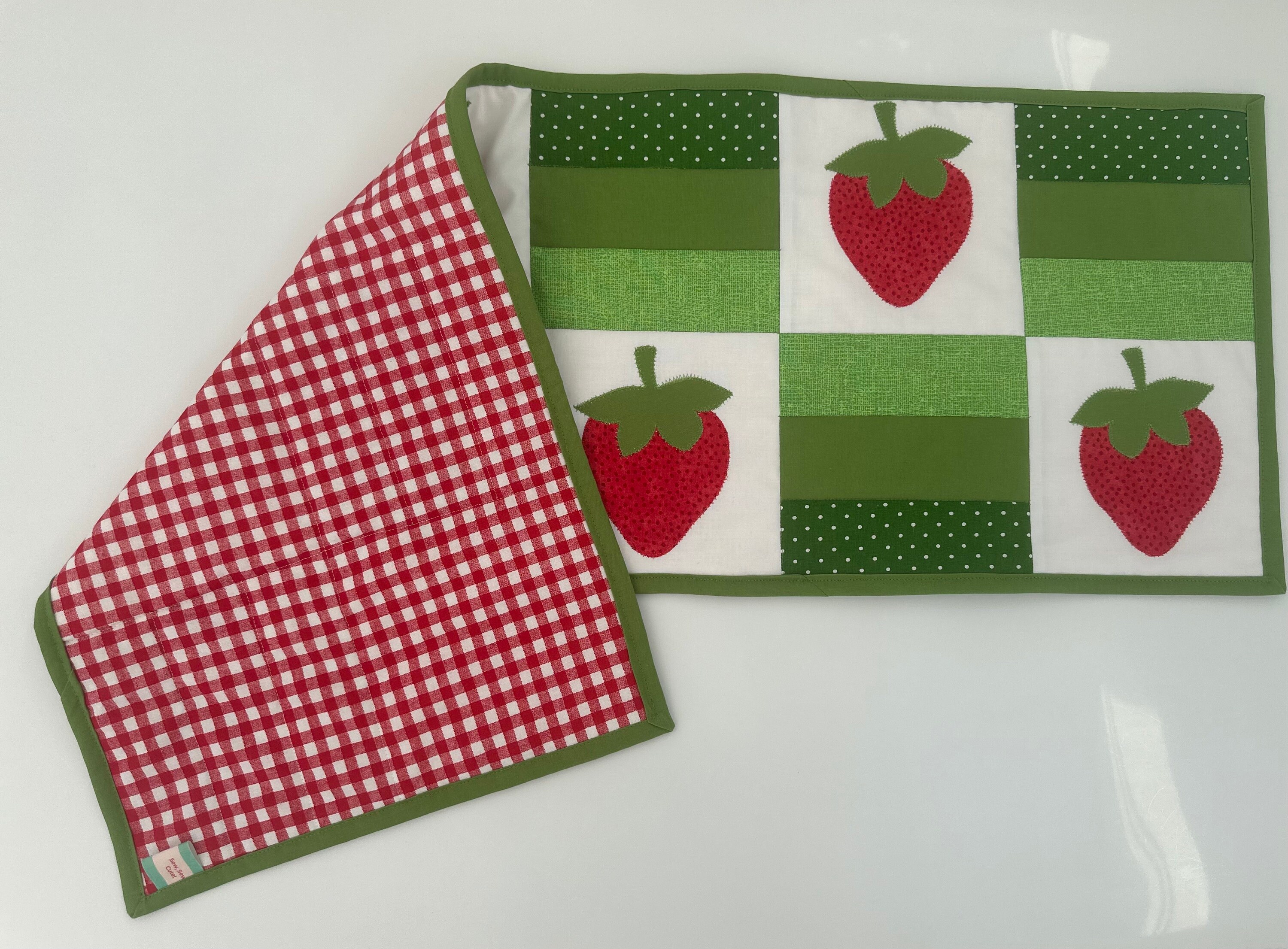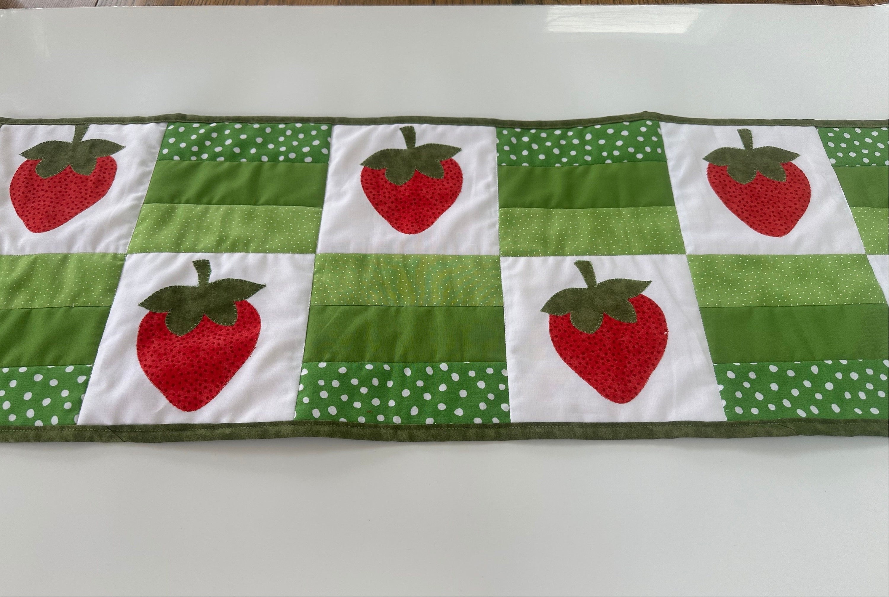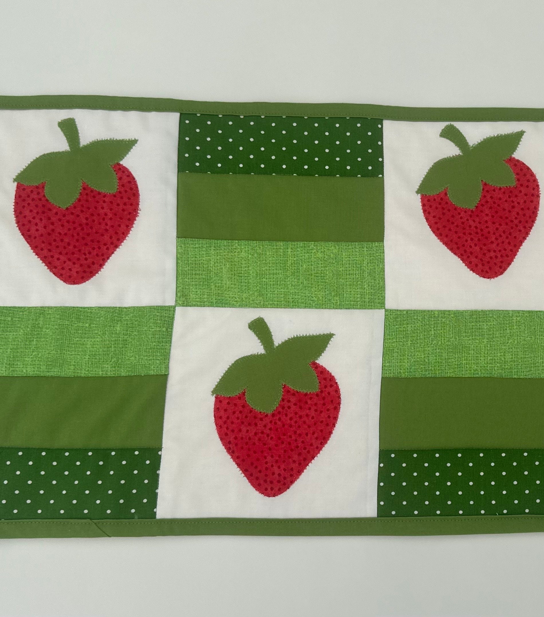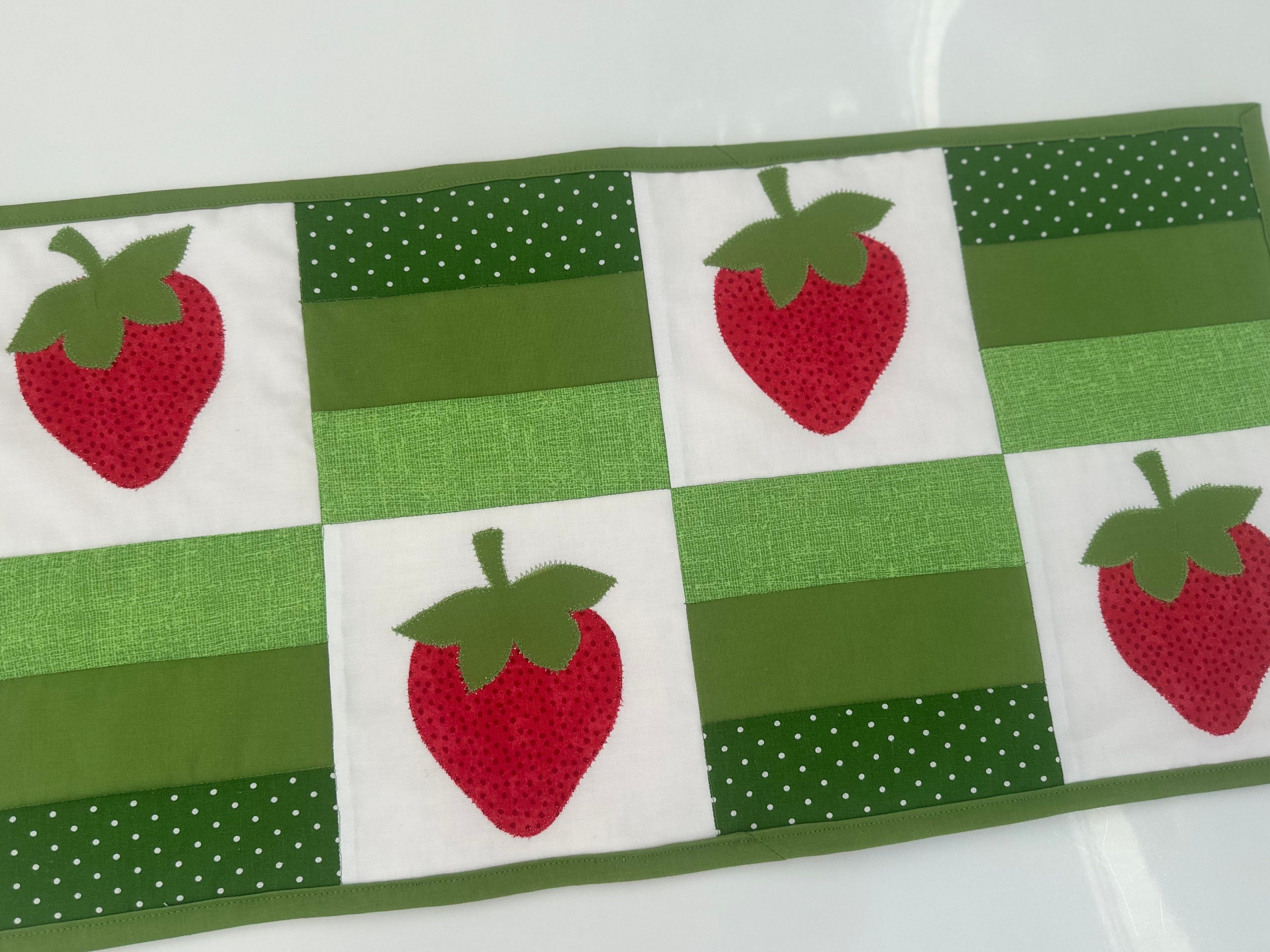 Strawberries, red , green and white table runner. Easily adds color to your table, kitchen counter top or outdoor table setting.