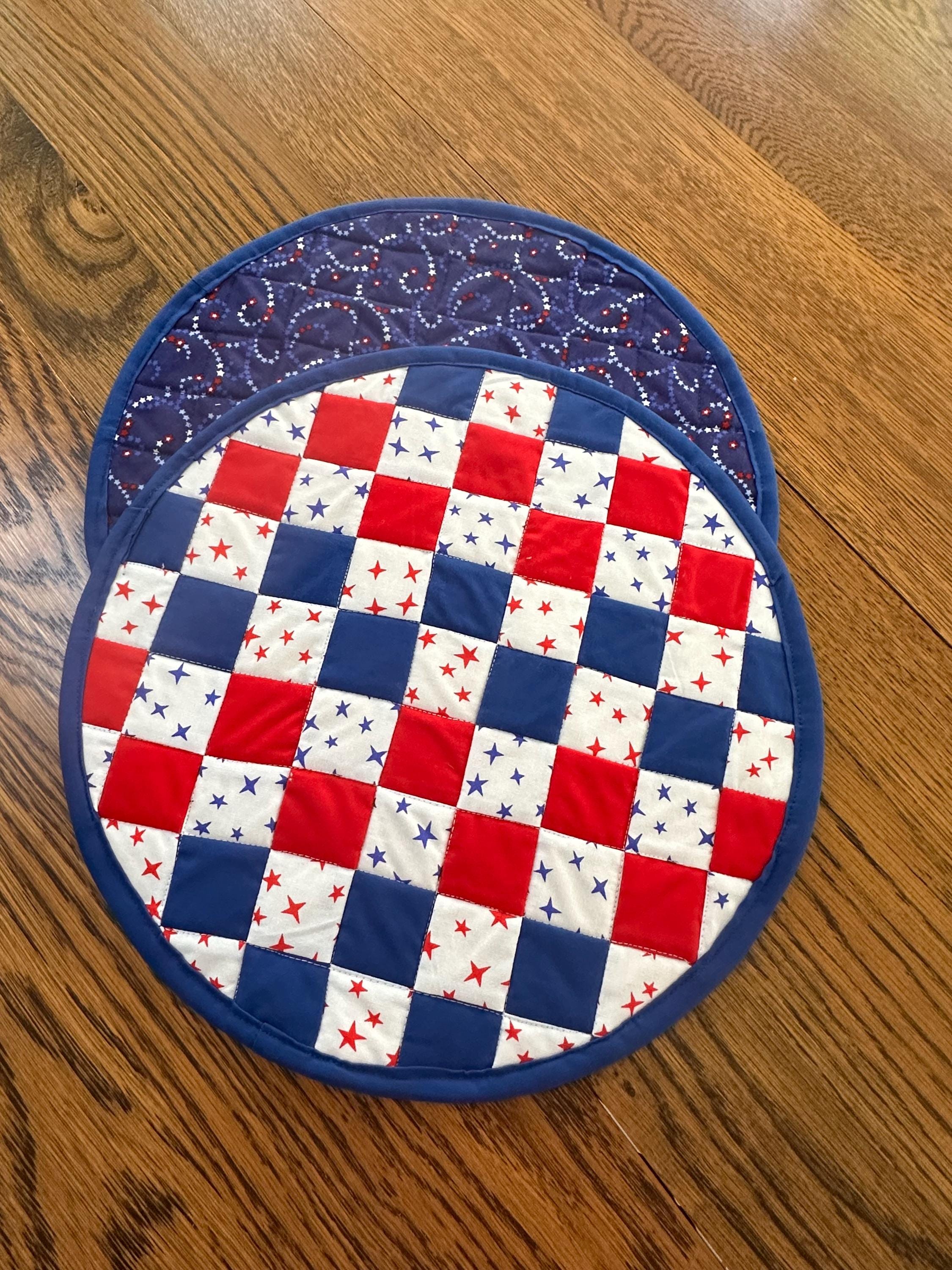 Quilted placemats with fabrics for the holiday season. Comes as a set of 2. Patterns and fabrics vary in each placemat. Pictures are of sample fabrics. Use as a topper on your end table or coffee table.