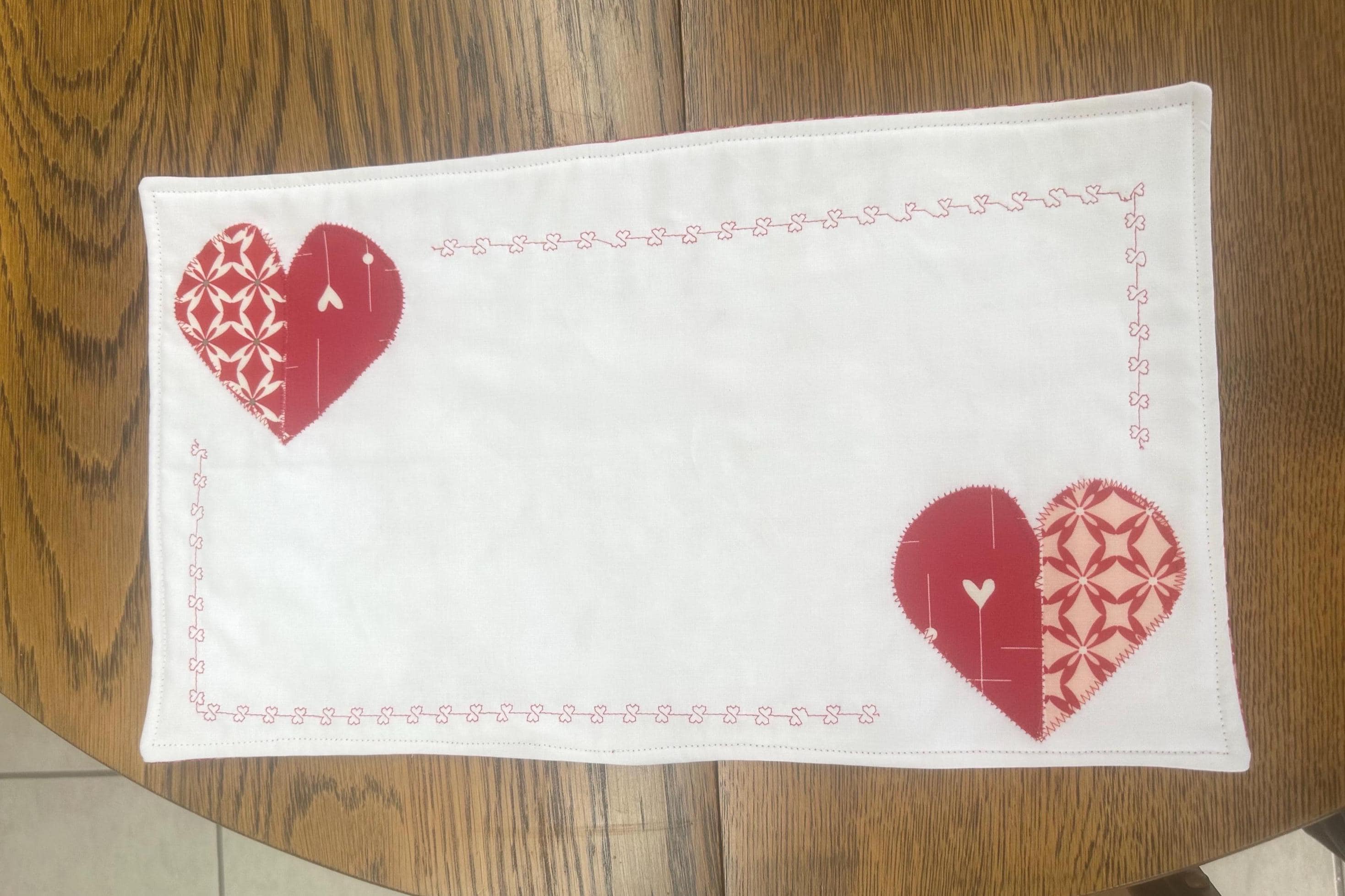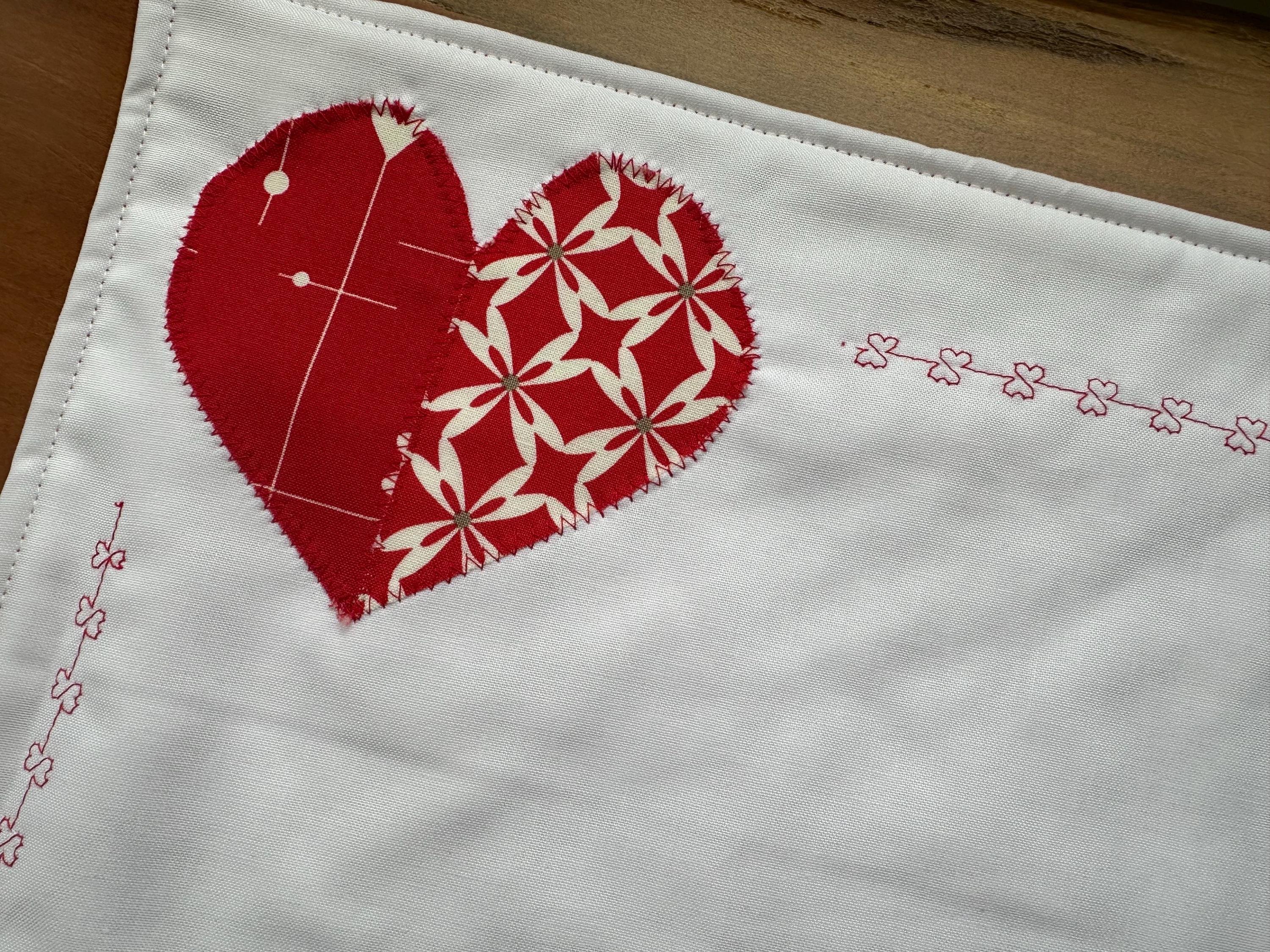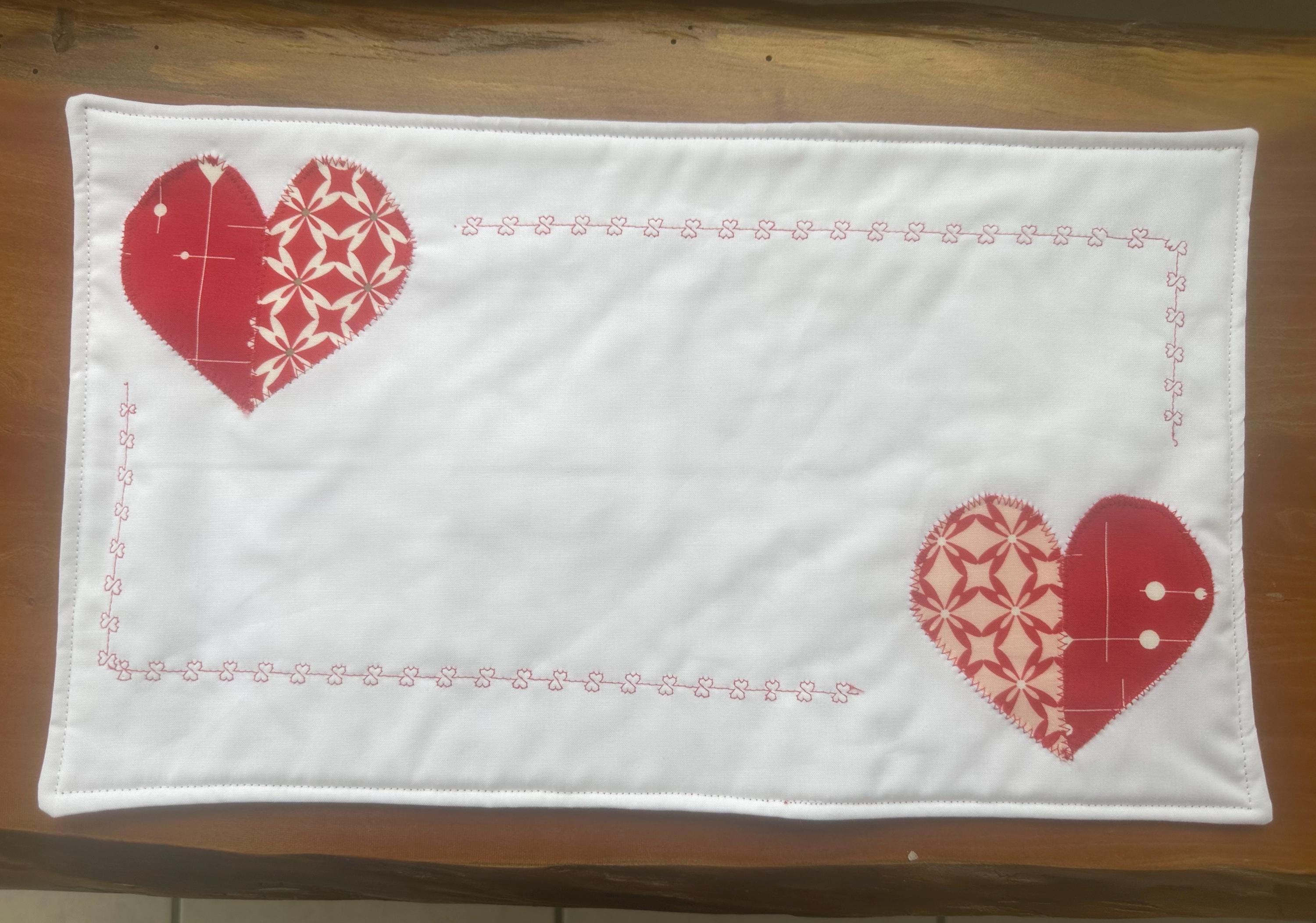 Set a holiday table with these heart placemats. Two hearts on adjacent corners with design hearts outlining the placemat. This set of 2 placemats will help create a romantic table scape.